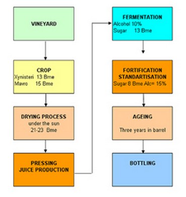Die Lese  erfolgt, wenn die Trauben der Rebsorten Mavro (rot) und Xynisteri (weiss)  mindestens 230 Gr/l Zucker enthalten. Dann werden die Trauben auf Strohmatten  wie beim Strohwein getrocknet. Das führt zu einer starken Konzentration. Der  Zuckergehalt erreicht jetzt 400 Gr/L.