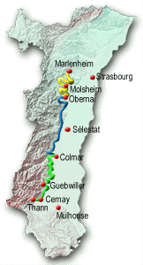 Das Elsass,  Alsace für die Franzosen, ist mit nur knapp 14.500 Hektar Rebfläche keine der  ganz grossen Weinbauregionen Frankreichs, aber diejenige mit dem vielleicht  eigenständigsten Charakter. Das Weinbaugebiet beginnt  im Norden bei Strassburg geht entlang der deutschen Grenze und reicht bis nördlich von Mulhouse  / Mülhausen in einem oft nur knapp zwei bis fünf Kilometer schmalen Band am  Fusse der Vogesen. Seine östliche Grenze  bildet der Rhein ab Basel.
