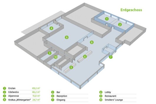 Die Tagungsräume Enzian und Edelweiss  befinden sich rechts vom Eingang/der Lobby