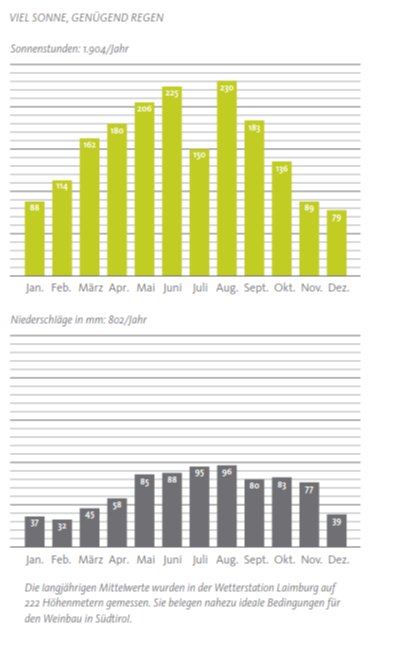 Südtirol profitiert zweifellos von günstigen klimatischen und geologischen Voraussetzungen. So schonen die Alpen im Norden die Weinberge vor kalten Winden. Hinzu kommt das milde, alpinkontinentale Klima mit über 300 Sonnentagen im Jahr und die grossen Temperaturunterschiede zwischen Tag und Nacht. Im Süden hingegen, öffnet sich der Talkessel, sodass die mediterranen Strömungen vom Gardasee und dem Mittelmeer kommend, die Reben verwöhnen. Dies zeigt sich dadurch, dass im südlichen Unterland, die Weißburgunder-Ernte gut 2 Wochen früher anfällt als im nördlichen Etschtal.43   Dadurch weist jede Lage sowohl ein spezifisches Mikroklima als auch eine eigene Bodenstruktur auf und die Weine erhalten einen ausgeprägt gebietstypischen Charakter.