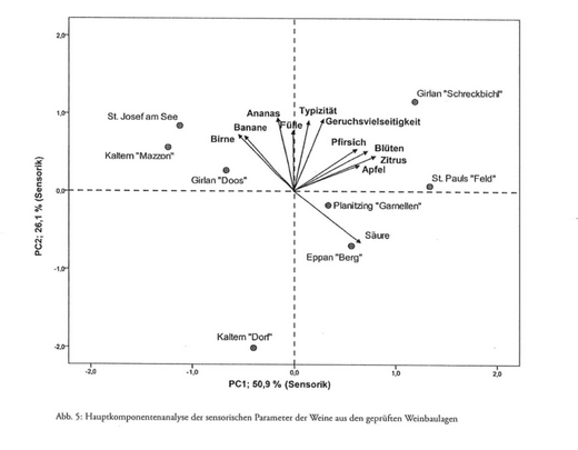 Allerding sollte bei der Beurteilung des Einflusses von Standortfaktoren nicht vergessen werden, dass im Südtirol die Bewässerung der Weinberge möglich ist und dadurch mit Sicherheit einige standortspezifische Faktoren verwischt werden.