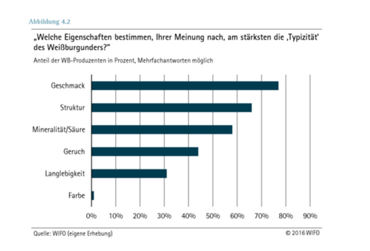 Anhand der Sorten-Lagen-Studie zeigten die sensorischen Eigenschaften einige signifikanten Unterschiede zwischen den einzelnen Weinberglagen. Nennenswert ist,  der deutliche Unterschied zwischen Weißburgundern verschiedener Höhenlagen bezüglich ihres analytischen Säurespektrums. Daraus kann auch das „unterschiedliche Säureempfinden im Mund“ bei der Verkostung der Weine abgeleitet werden. Es zeigte sich, dass auf Böden von tieferen Lagen (St.Josef am See/Kaltern) mit höheren Jahresdurchschnittstemperaturen, die für die Erkennung der Sorte wichtigen Aromadeskriptoren „Apfel-Birne“ zu wenig ausgeprägt sind. In höheren Lagen aber mehr „Zitrusfrucht-Apfelnoten“ dominieren. Die Bodenzusammensetzung hat sich ebenso auf das Säurespektrum niedergeschlagen, so führten sandige und saure Böden zu niedrigeren Säurewerten.