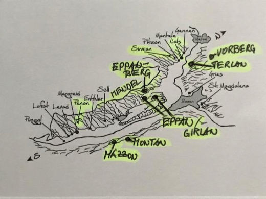 Besonders charaktervolle, säurebetonte, frische Weißburgunder stammen aus Lagen der Dörfer Mazon und Montan auf der linken, und gleichzeitig kühleren Talseite, mit Weinberglagen von bis zu 800 m. Die weltweit einmalig steinigen Böden aus Dolomit-Kalkgestein42  prägen die mineralische Frische und straffe Säure im Wein.