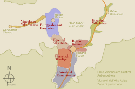 Die Weinbauflächen Südtirols konzentrieren sich auf die klimatisch milderen Tal-und Hanglagen, die von den hohen Alpenausläufern umschlossen sind. Die bevorzugten Anbaugebiete des Weißburgunders, die sich insbesondere ab Höhen von 350m hervortun, grenzen sich wie folgt ab: