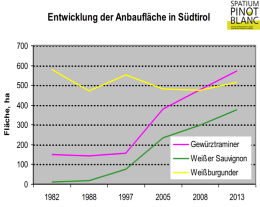 Für Jahrzehnte war die nördlichste Provinz Italiens primär für Rotweine bekannt. Noch vor 30 Jahren war weniger als ein Drittel der gesamten Rebfläche mit Weißweinreben bepflanzt.  Erst ab 1985 wurde zwischen Chardonnay und Weißburgunder offiziell unterschieden, was zur Folge hatte, dass deren Anbaufläche um 153 ha schrumpfte, aber mittlerweile wieder 535 ha ausgewiesen werden. Dies entspricht 9.82% der Gesamtweinbaufläche Südtirols.